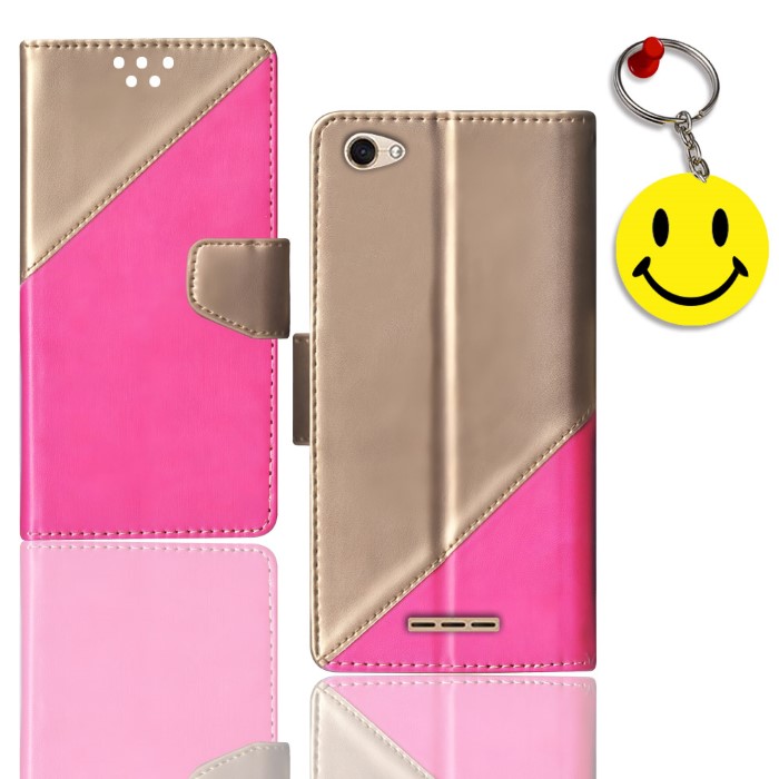 Pink, Gold flip cover Lava Z61 / Z61 Pink, Gold Flip case – Premium Looks – Glistening deluxe leather surface provides your phone with a rich sophisticated look Anti-Slip – Anti slip textured surface for better grip on sides enables better handling of your device Perfect Cutouts – Full access to all features like cameras, speaker, ports and buttons Easy Closure & Convenient Stand – Gentle but firm magnetic clasp to secure the case intact and easy opening & convenient stand for Wallet Stand case enables hands free movie watching or video chatting in landscape mode. FREE SMILEY KEYCHAIN