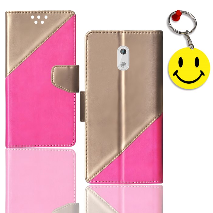Pink, Gold flip cover Nokia 3 / TA-1032 Pink, Gold Flip case – Premium Looks – Glistening deluxe leather surface provides your phone with a rich sophisticated look Anti-Slip – Anti slip textured surface for better grip on sides enables better handling of your device Perfect Cutouts – Full access to all features like cameras, speaker, ports and buttons Easy Closure & Convenient Stand – Gentle but firm magnetic clasp to secure the case intact and easy opening & convenient stand for Wallet Stand case enables hands free movie watching or video chatting in landscape mode. FREE SMILEY KEYCHAIN