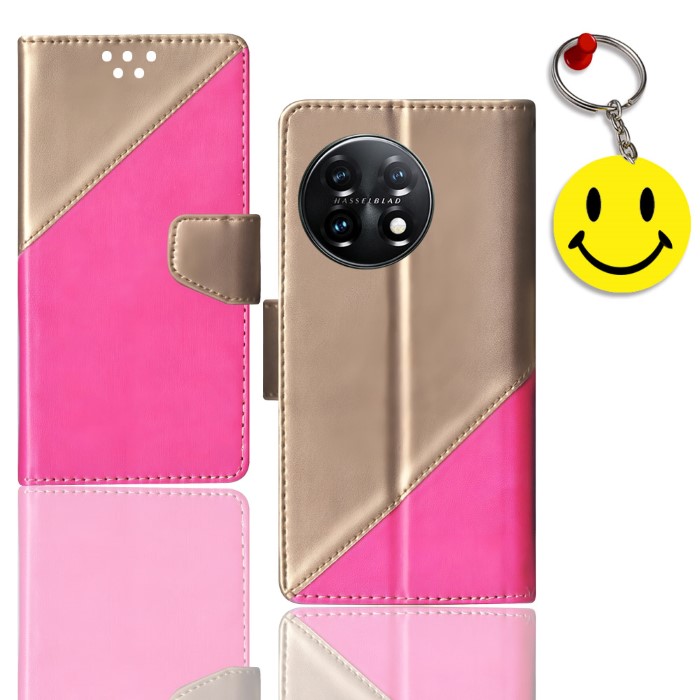 Pink, Gold flip cover OnePlus 11 / PHB110 Pink, Gold Flip case – Premium Looks – Glistening deluxe leather surface provides your phone with a rich sophisticated look Anti-Slip – Anti slip textured surface for better grip on sides enables better handling of your device Perfect Cutouts – Full access to all features like cameras, speaker, ports and buttons Easy Closure & Convenient Stand – Gentle but firm magnetic clasp to secure the case intact and easy opening & convenient stand for Wallet Stand case enables hands free movie watching or video chatting in landscape mode. FREE SMILEY KEYCHAIN