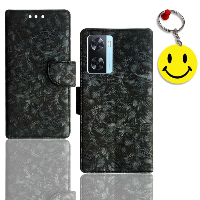 Black, leaf flip cover Oppo A77 5G / CPH2339 Black, leaf Flip case – Premium Looks – Glistening deluxe leather surface provides your phone with a rich sophisticated look Anti-Slip – Anti slip textured surface for better grip on sides enables better handling of your device Perfect Cutouts – Full access to all features like cameras, speaker, ports and buttons Easy Closure & Convenient Stand – Gentle but firm magnetic clasp to secure the case intact and easy opening & convenient stand for Wallet Stand case enables hands free movie watching or video chatting in landscape mode. FREE SMILEY KEYCHAIN