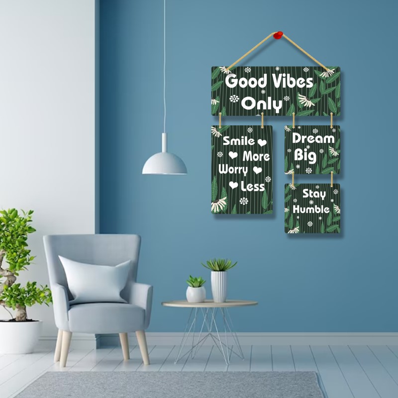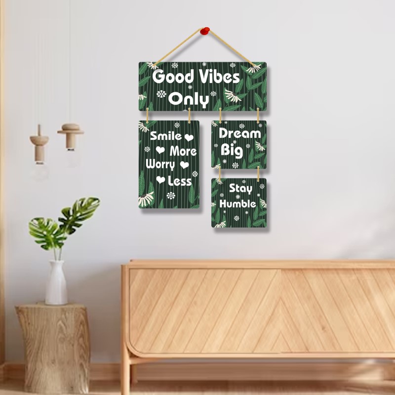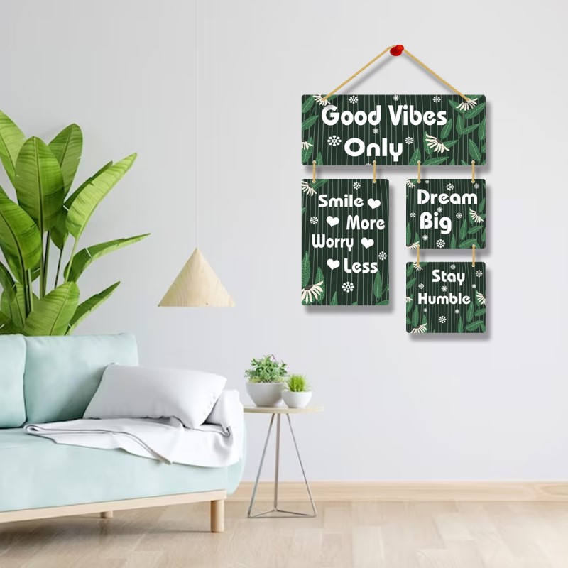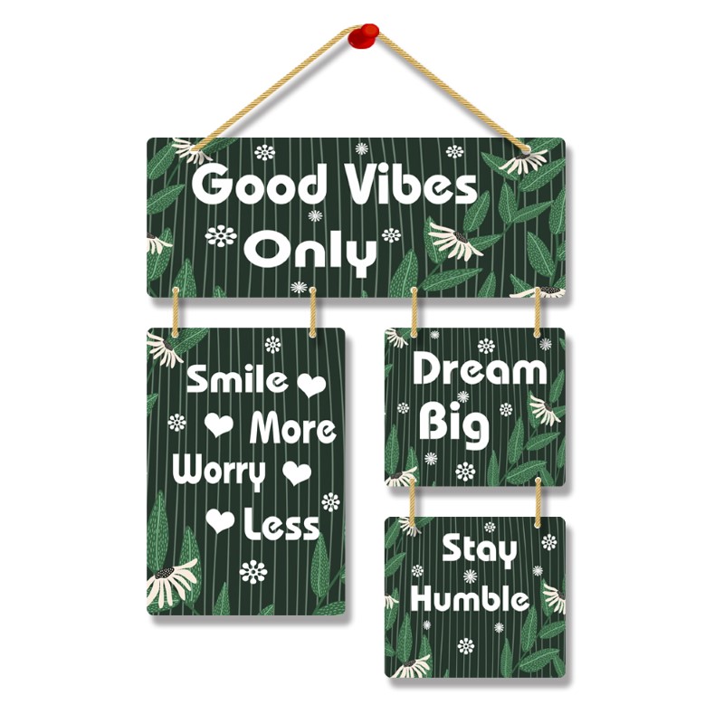 Elevate your living space with our Wooden “Good Vibes Only” Positive Quote Wall Hanging Art – a harmonious blend of aesthetic charm and inspirational messages. This meticulously crafted decor piece features encouraging phrases like “Smile More,” “Worry Less,” “Dream Big,” and “Stay Humble.” Made from premium wood, this wall hanging not only adds a touch of elegance but also radiates positivity. Each phrase serves as a daily mantra, promoting joy, reducing stress, fostering ambition, and encouraging humility. Transform your home into a haven of good vibes, where the art on your wall inspires a life filled with positivity, optimism, and purpose.